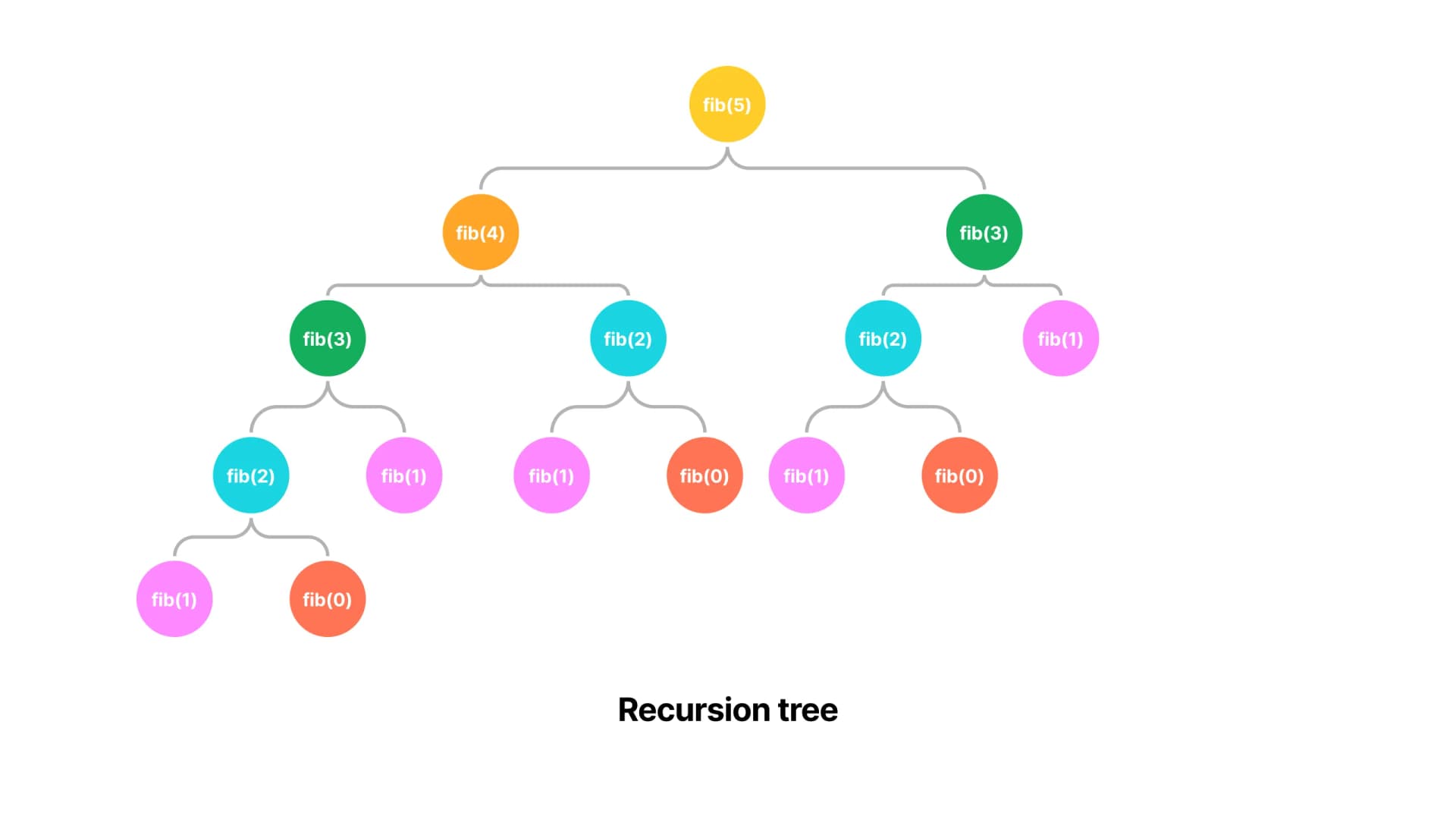 Memoization is an optimization technique used primarily to speed up computer programs by storing the results of expensive function calls and returning the catch result when the same inputs occur again. If we take a look at the recursion tree from the image above, it's easy to realize that there are lots of identical nodes. For example fib(3) appears twice and fib(2) appears three times. Why should we recompute these from scratch each time? We should just cache those results and use it later.