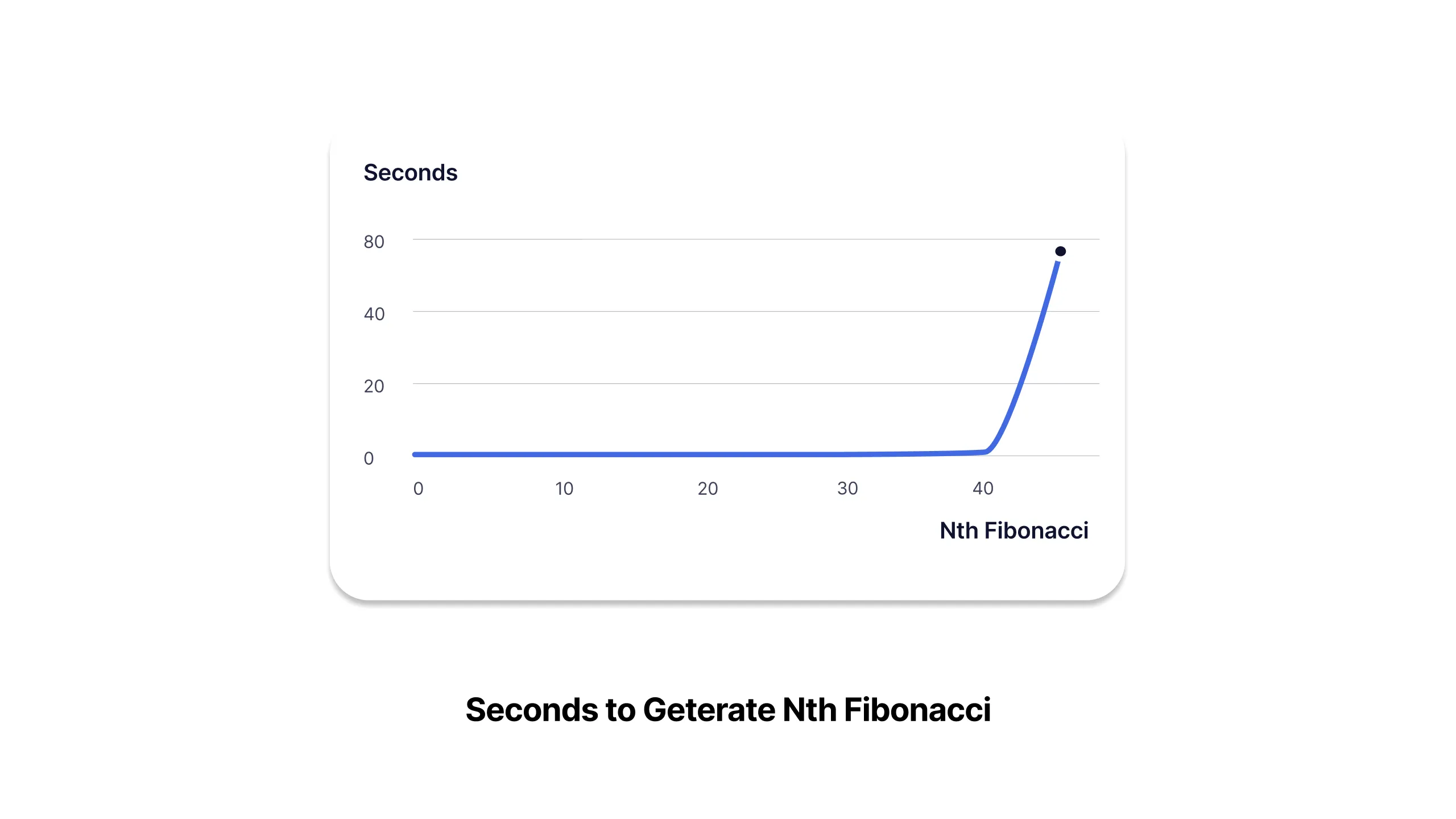 Like I said before, this solution has a terrible runtime. If we implement this in a computer, we would see that the number of seconds to generate Nth Fibonacci increase exponentially.
